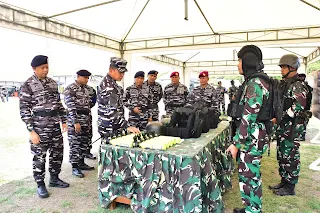 Didampingi oleh Kepala Staf Kolinlamil Laksma TNI Mochammad Riza, S.E., M.Tr. Opsla., CRMP dan Asops Pangkolinlamil Kolonel Laut (P) Awang Bawono, S.E., M.M., M.A.P., CRMP. selaku Kawasdal meninjau kesiapan yang dimulai dari berbagai peralatan yang digelar di tenda tim kesehatan, tim penyelam, dan pasukan marinir, kemudian dilanjutkan dengan pengecekan personil dari masing-masing unsur yang terlibat.