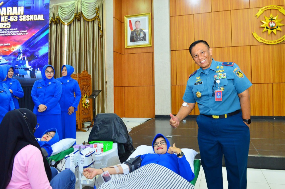 Komandan Sekolah Staf dan Komando Angkatan Laut (Danseskoal) Laksamana Muda TNI Ariantyo Condrowibowo didampingi Ketua Cabang Berdiri Sendiri Jalasenastri Seskoal Ny. Dian Ariantyo Condrowibowo meninjau langsung donor darah dalam rangka menyambut Hari Ulang Tahun (HUT) ke-63 Seskoal yang jatuh pada tanggal 26 November 2025. Selesai meninjau pelaksanaan donor darah, Ketua Cabang Berdiri Sendiri Jalasenastri Seskoal melaksanakan donor darah. Kegiatan donor darah ini dilaksanakan atas kerja sama Satuan Kesehatan (Satkes) Seskoal dengan Unit Transfusi Darah (UTD) Rumah Sakit Kanker Dharmais menggelar Bakti Sosial Donor Darah, bertempat di pendopo gedung Jos Soedarso Seskoal, Cipulir, Kebayoran Lama, Jakarta Selatan, Selasa (18/11/2025). ![]() Kegiatan donor adalah proses pengambilan darah secara sukarela untuk disimpan di bank darah dan digunakan untuk transfusi darah. Kegiatan ini bermanfaat bagi penerima darah, juga bagi pendonor seperti meningkatkan kesehatan jantung dan mengurangi risiko kanker. ![]() Selesai kegiatan donor darah, Danseskoal menjelaskan “Kegiatan donor ini dilakukan untuk memenuhi kebutuhan orang-orang yang memerlukan tambahan darah seperti trauma berat yang kehilangan banyak darah, anemia, talasemia, hemofilia, hingga leukimia. Tujuan donor darah adalah untuk kepentingan sosial dan kemanusiaan. Setetes darah kita akan menyelamatkan jiwa manusia”. ![]() Turut melaksanakan donor darah Wadan Seskoal Laksamana Pertama TNI Dr. Ferry Supriady, S.T., M.M., M.Tr.Opsla., CIQaR., Kakoordos Seskoal Laksamana Pertama TNI Dr. Goky P. Sihombing, S.E., M.Si.(Han)., para Pejabat Utama Seskoal, perwakilan Pasis Dikreg Seskoal, para prajurit dan Pegawai Negeri Sipil (PNS) Seskoal dan Pengurus serta anggota Cabang Berdiri Sendiri Jalasenastri Seskoal. |